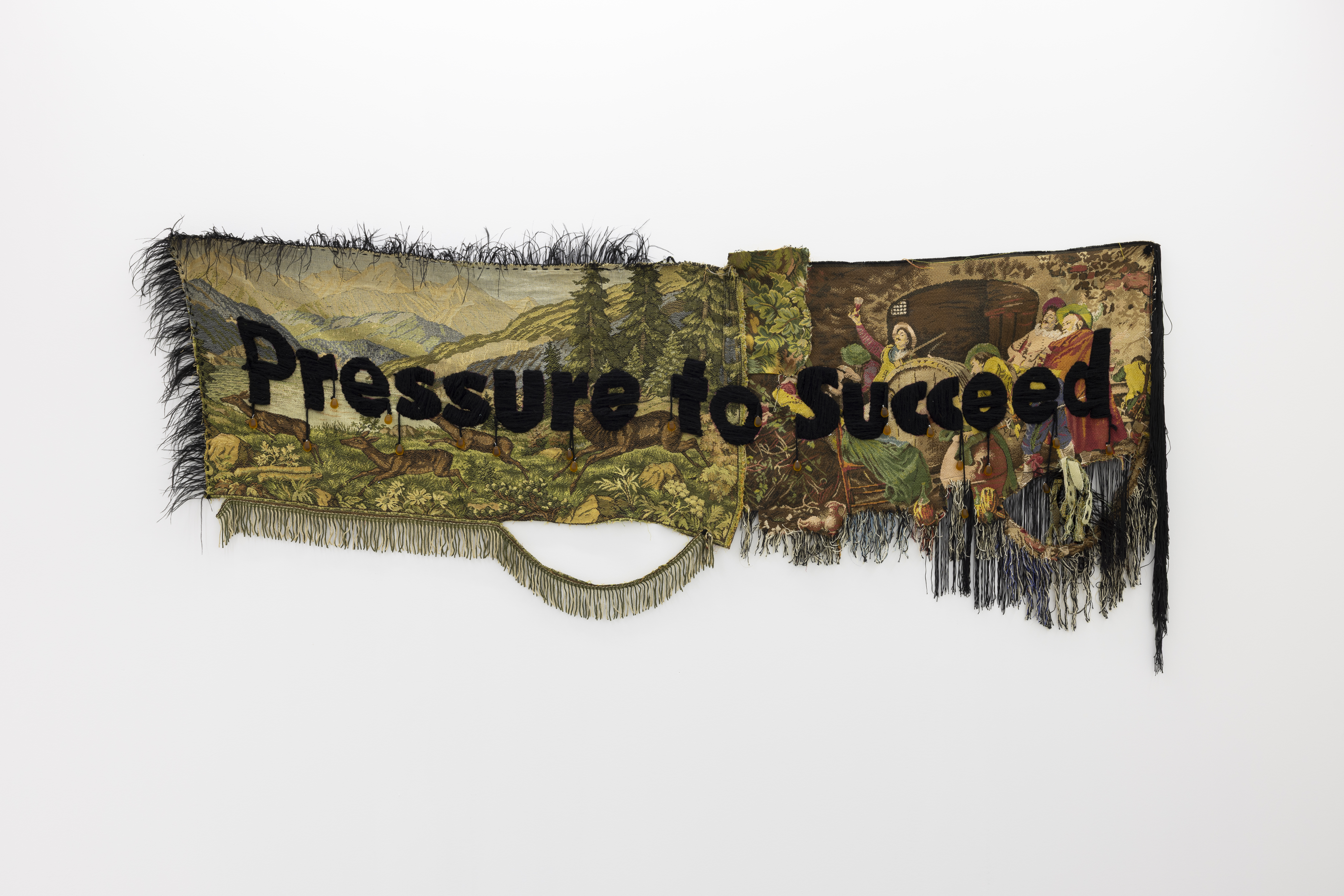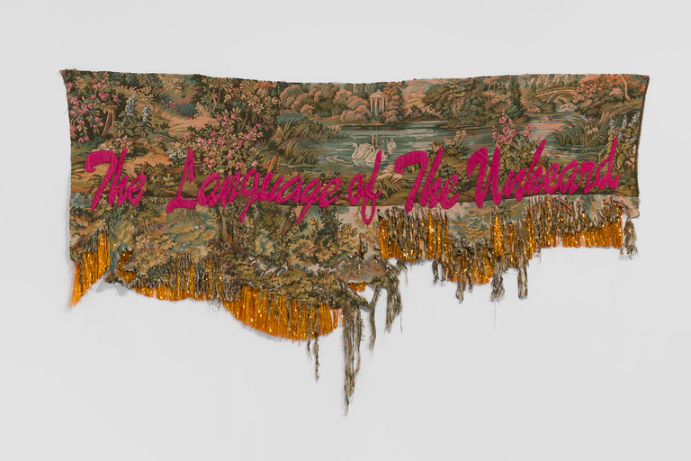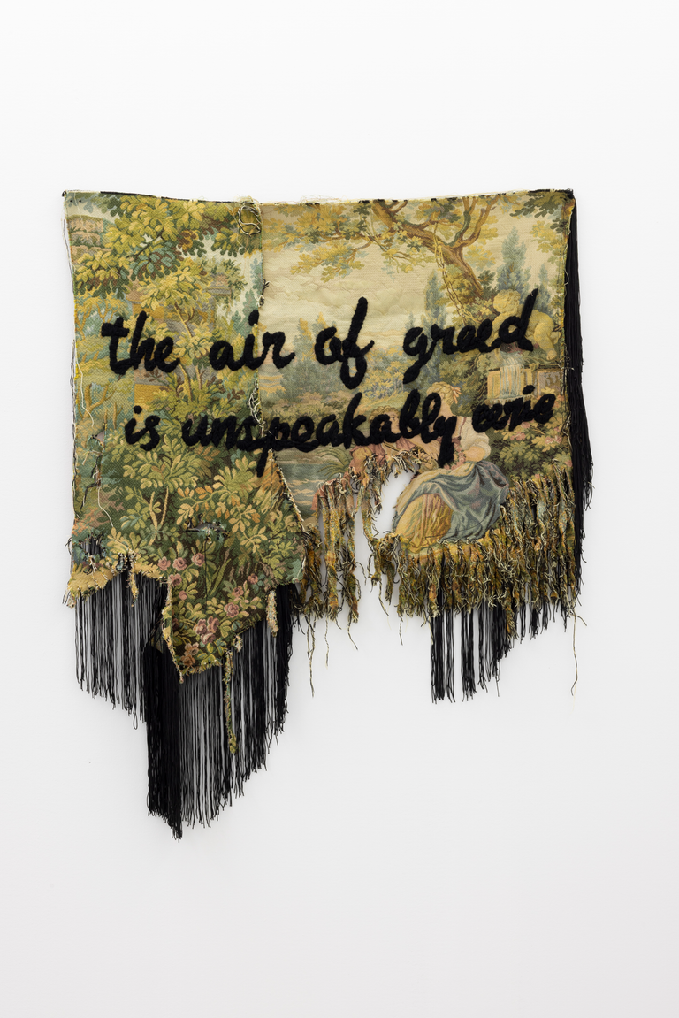 Pressure to succeed, 2025, Embroidery on re-worked vintage Soviet period tapestries, feathers, vintage glass droplets, fringe 70 x 210 cmThe air of greed is unspeakably eerie, 2025 Embroidery and fringes on re-worked vintage Soviet period tapestries, 90 x 77 cmThe Language of the Unheard, 2025, Modified tapestries, synthetic yarn, gold fringes 170 x 230 cmAll the Unexpressed Love, 2025, Modified tapestries, synthetic yarn, gold Fringes, 112 x 85 cmPatriotic Subjectivity, 2024 modified tapestry, synthetic yarn, 170 x 215 cmPolitics of Altered Realities, 2025, modified tapestry, synthetic yarn, feathers, 103 x 213 cmFalse Compassion, 2025 modified tapestry, synthetic yarn, metal, 135 x 69 cmEnforced Degradation, 2025 modified tapestry, synthetic yarn, metal, lace, 90 x 96 cmCycle of Disappointment, 2024, Embroidery on factory made, Soviet Period distressed and burnt tapestry, with fringes and feathers, 170x90cmPain of the Defeated 2024, Embroidery on factory made, distressed tapestries, feathers, 115x95cmFragile Democracy, 2024 Embroidery on factory made, distressed and Burnt tapestry, Fringes, 65x85cmTrauma Porn, 2024 Embroidery on factory made, distressed and Burnt tapestry, Garnet stones, 65x85cmIntentional Blindness, 2023 Mixed Media and Crystals on Soviet Period re-worked tapestries, 150x75cmCitizen of Nothing, 2023 Embroidery on vintage soviet Period tapestries, woollen ball shaped pom-poms, 204:65cmHistory of Shame, 2023 Embroidery, raw Aventurine stone and on re-worked(torn, burnt and cut) Tapestry 115x95cmHistory of Pain, 2023 Embroidery and golden fringes on re-worked(torn, burnt and cut) Tapestry 115x95cmMinor Injustice, 2023 Embroidery on re-worked tapestry, silver fringes 73 :60cm /73: 110cm with fringesMorally Corrupt, 2022 Embroidery on vintage Italian jacquard tapestries, 65x110cmPoverty Porn, 2022 Acrylic thread embroidery on re-worked (torn, burnt) vintage Italian Jacquard Tapestry. 67x117cmGenerational Trauma, 2022 Embroidery on vintage Italian jacquard tapestries, 170x110cmECONOMICS OF BETRAYAL, 2022 Embroidery on Factory made re-worked, torn, tapestries, 3 large metal nails 85 (H) x 65(W) cmმოკლე მეხსიერება, 2022 Crystal beads, Coral and embroidery on re-worked Soviet Period velvet tapestries 90 (H) x 125(W) cmTHROUGH THE BLIZZARDS, THROUGH THE WARS, 2022 Embroidery on reworked and burnt vintage Soviet period tapestry with golden fringes. 258 x 103cmMagnitude of Fear, 2022 Embroidery on reworked and burnt vintage Soviet period tapestry with golden fringes. 120 x 150 cmBrutal Honesty, 2022 Embroidery on Soviet period re-worked, torn, burnt tapestries, Glass beads 60x260cmForever Anxiety, 2021 Wool and gold thread embroidery on factory made, re-worked tapestry, wooden beads 178x70cmContinuous Celebration, 2021 Gold thread embroidery and beads on machine-made tapestries 46x110cmFormal Moral, 2020 Embroidery on vintage Soviet period tapestries 50x260cmThe Drive To Thrive, 2020 Embroidery on vintage Soviet period re-worked tapestry 60x260cmI Recycle My Tears, 2020 Embroidery on vintage soviet period re-worked tapestries 60x260cmFar from Alone, 2020 Gold thread embroidery on factory made, re-worked tapestries 60x145cmWhat is Time, 2020 Gold thread embroidery on re-worked, factory made tapestries 65x135cmგათენდება ხვალ, 2020 Wool thread embroidery on factory made, re-worked tapestry 65x135cmჯოს, ჯოს, ჯოს, 2019 Wool thread embroidery on factory made, re-worked tapestry 68x138cmFavorite Forevers, 2020 Wool thread embroidery on factory made, re-worked velvet tapestries, crystal beads 120x150cmI Know Your Secrets, 2019 Gold thread embroidery on machine made, re-worked tapestries 70x130cmInstitute of Virginity, 2019 Wool thread embroidery on factory made, re-worked tapestries 93x112cmSunrise Tomorrow, 2019 Wool thread embroidery on factory made, re-worked tapestry 69x120cmPermanent Adolescence, 2019 Silk ribbon embroidery on factory made, re-worked tapestry 66x138cmPrivet Kultura, 2019 Embroidery on factory made, re-worked rug 69x40cmAt Least Man Walks on the Moon, 2018 Wool thread embroidery on factory made, re-worked tapestry 70x110cmPur- Marili Politics, 2018 Wool thread embroidery on factory made, re-worked tapestry 60x150cmStay Related and ეგზოტიკური / Exotic, 2018 Wool thread embroidery on factory made, re-worked tapestries 60x300cm3 fairy tales per person, 2018 Wool thread embroidery on factory made, re-worked tapestrყSo Far So Good, 2018 Wool thread embroidery on factory made, re-worked tapestries 70x350cm